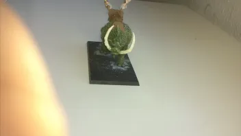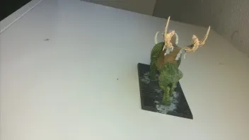 Beim Trauerfang wollte ich nicht unbedingt das gewöhnliche Farbschema anwenden und ihn außerdem "fleckig" machen so wie meine Katze. Hat glaube ich nicht so ganz geklappt, aber ich bin zunächst zufrieden. Die Knochen/Hörner vorne und hinten müssen noch gemacht werden + den Sattel. Die Wunden am rechten Vorderbein gefallen mir ganz gut -> Elfic Flesh (Vallejo Game Color) + Baal Red (Citadel Washes).