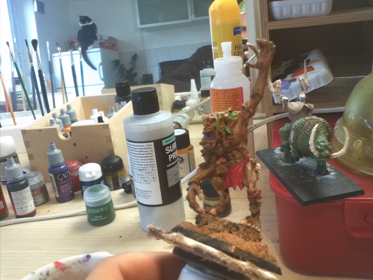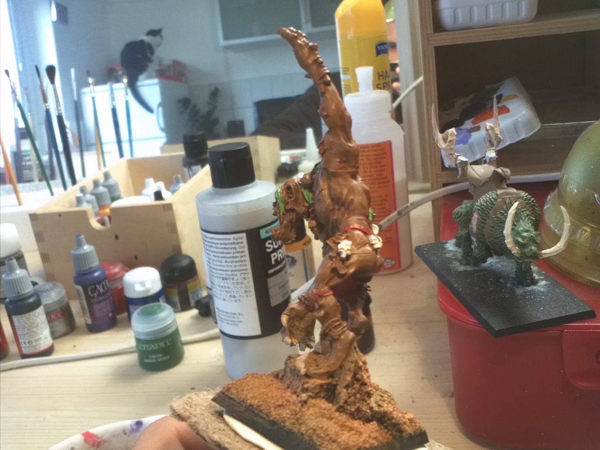 Verschlinger: MEIN erstes Finecast-Modell und bei weitem nicht der Horror, den meine Freundin bei ihrem Baummenschen (wir mussten ihn schlussendlich reklamieren, da einfach nichts gepasst hat) durchmachen musste. Aber trotzdem gibts Probleme. Abgesehen davon, dass nichts wirklich zusammen passt und viel mit Green Stuff gestopft werden muss, blockiert der rechte Arme das Aufkleben auf die Bases und so habe ich die ein bisschen Kork genommen und das erste Mal so eine "Special-Base" in Angriff genommen. So kann ich die Füße auf den Kork kleben und der Arm ragt ein bisschen vorne drüber, sodass nichts blockiert wird. Ich glaube, ich werde ihn heute noch grundieren und dann bald mit der Bemalung beginnen, da mich das Modell reizt..ich denke an irgendwas sehr komisches..vielleicht eine bräunliche Grundhautfarbe und dann immer mehr Gelb reinmischen. Mal schauen :]