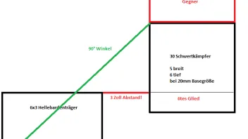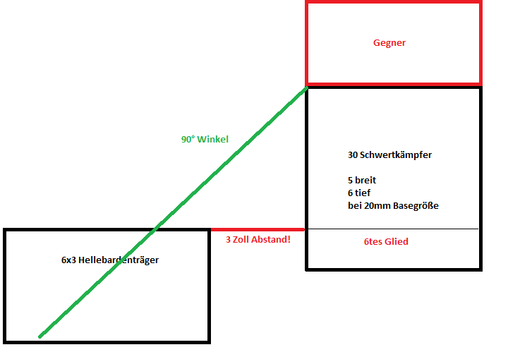 aka: ich würde sagen wenn man seine abteilung parallel zum Hauptregiment aufstellt, und die 3'' maximal ausnutzt kann man eine 6 breite abteilung, auf höhe des 5,5ten gliedes (zwischen 5 und 6) aufstellen, um noch ziehmlich sicher die flanke zu bekommen.