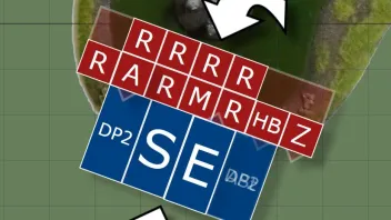 • Fragt sich noch was wir beim Nahkampf auf der rechten Seite machen. Wenn wir den AST nicht in Reichweite der linken Flanke bringen, könnte uns eine schnelle Neuformierung da leicht die Schussphase kosten. (1/12tel Chance für eine 11+ Moralwert)