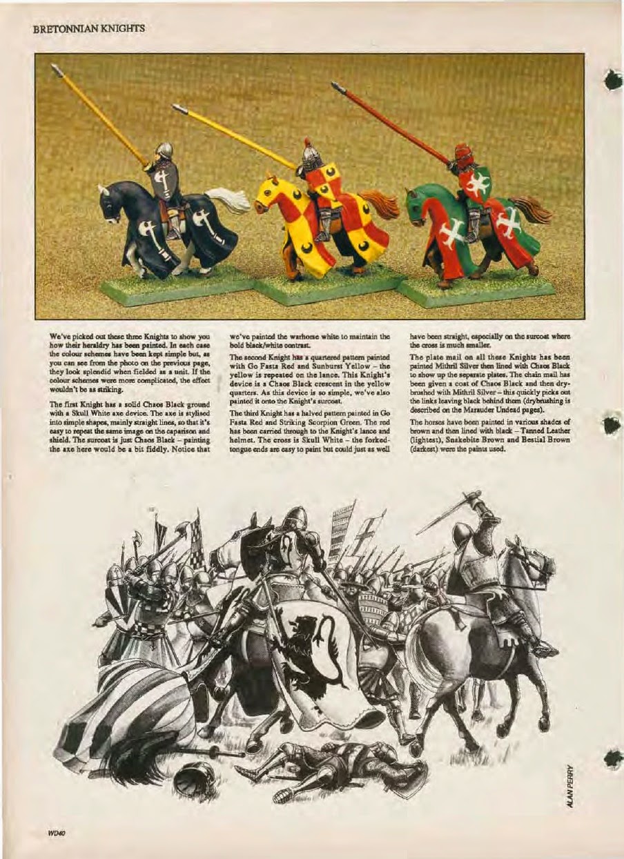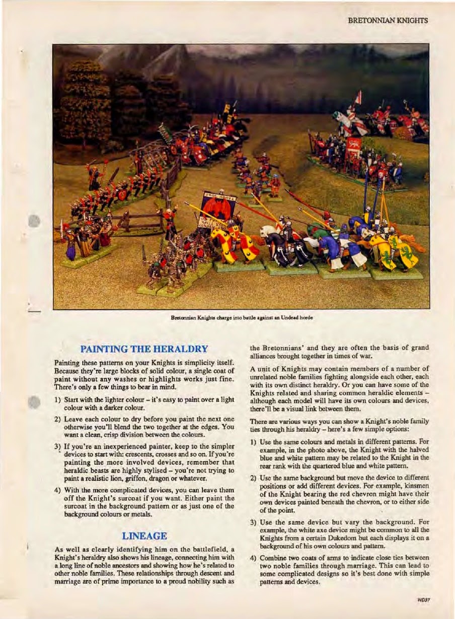 Die bretonische und die historische Linie können sich ausschließen, müssen es aber nicht. Bei den Modellen die ich in meiner Armee selbst bemalt habe, hab ich mich weitestgehend an die historische Regelung gehalten. Das bedient beide Regelwerke und sieht gut aus. (Bzw. ist die historische Linie die eindeutig bessere wenn es um die Erkennbarkeit auf dem Schlachtfeld geht.)
