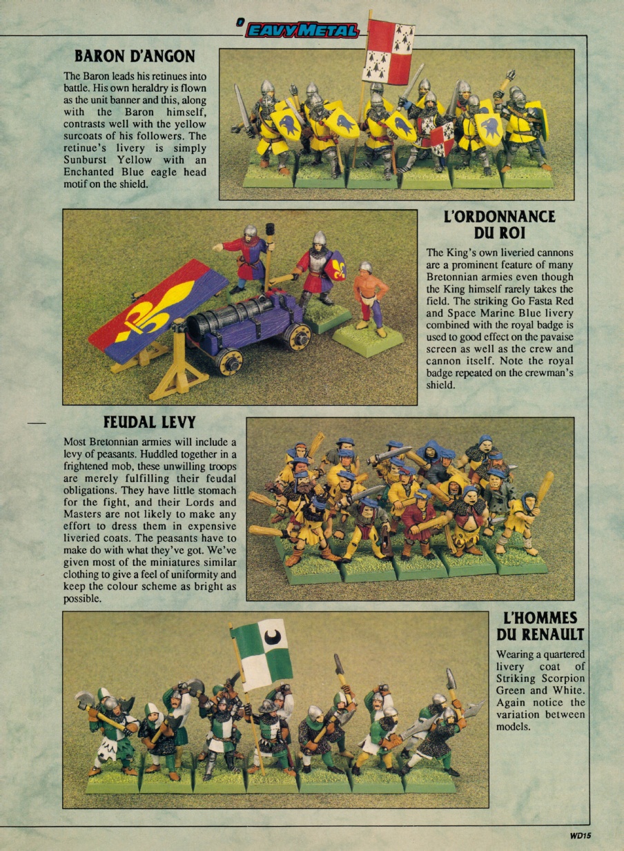 Bretonen hatten in der 4. Edition zwar noch kein eigenes Armeebuch, orientierten sich aber sehr stark am Vorbild der Vorgänger Edition, inklusive Artillerie und einer breiten Auswahl an Fußtruppen. Zusätzlich zu der Liste aus der Starterbox gab es noch einen Artikel im White Dwarf 137, in dem die Fußtruppen noch einmal mit ihre damals aktuellen Regeln vorgestellt wurden.