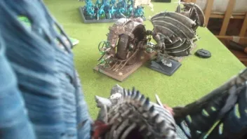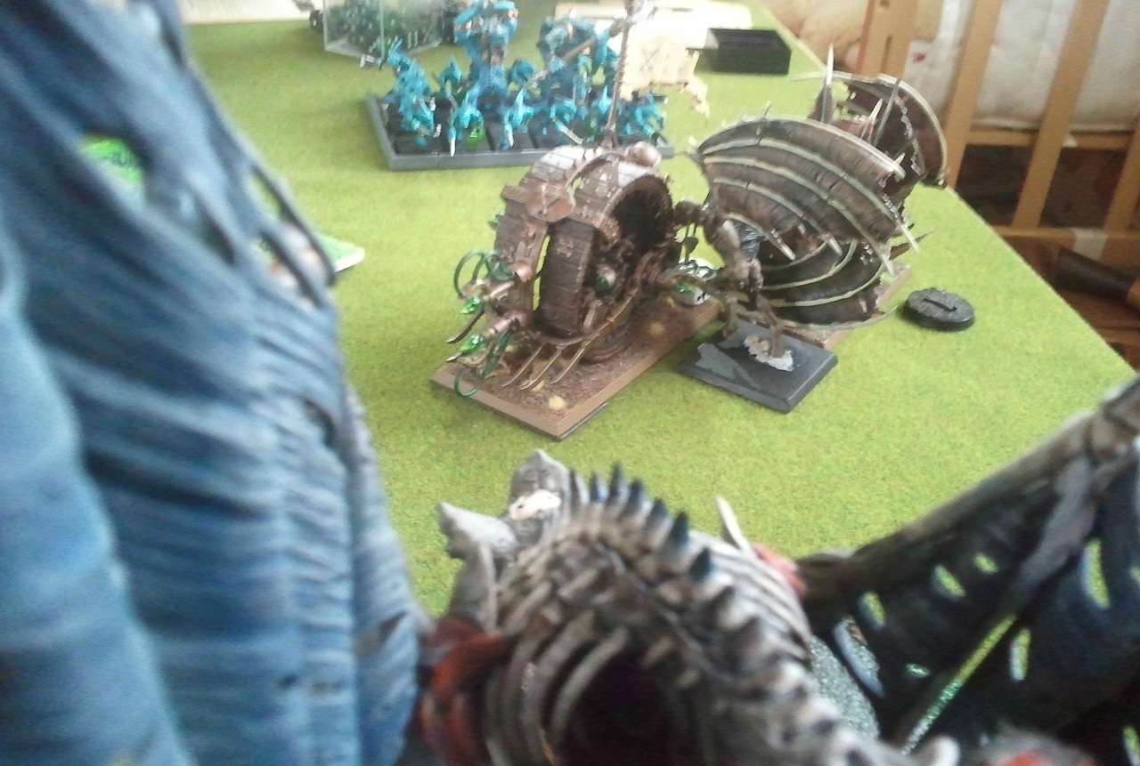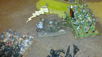 Der Pilot des Todesrades sah die geflügelten Tot-Dinger auf sich zu stürzen und drückte reflexmäßig auf den Auslöser für die Warpspulen. Die grünen Strahlen umfingen ihre Opfer mit einer tödlichen Liebkosung und ließen zwei von ihnen als rauchende Masse verkohlten Fleisches zurück. Ähnlich erging es einigen Rittern, die von der Warpblitzkanone als Ziel auserwählt wurden und nun mit ihren Rüstungen und Pferden zu einem einzigen Klumpen verschmolzen waren. Die beiden riesigen Schuppendinger mit ihrem wuseligen Gefolge versuchten das Todesrad gegen den verbliebenen Vargheist zu unterstützen, doch bevor sie mit ihren mächtigen Keulen zuschlagen konnten, verschwand ihr Ziel unter dem Hölzernen Rad. Am anderen Ende des Schlachtfeldes tauchten eine Gruppe schwarz gewandeter Skaven im Rücken des Feindes auf und schlichen auf die hoch aufragende Kriegsmaschine zu.