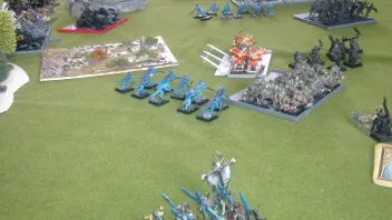 Angezogen durch diesen Schwall nekromantischer Macht erschienen vereinzelte Geisterscharen auf dem Schlachtfeld. Zur Seite des Mortis-Schreines wurde eine Einheit Zombies aus dem Boden gehoben, während eine Gruppe Ghule, zusammen mit der riesigen Flederbestie sowie drei Vargheistern auf der rechten Flanke aufmarschierte.