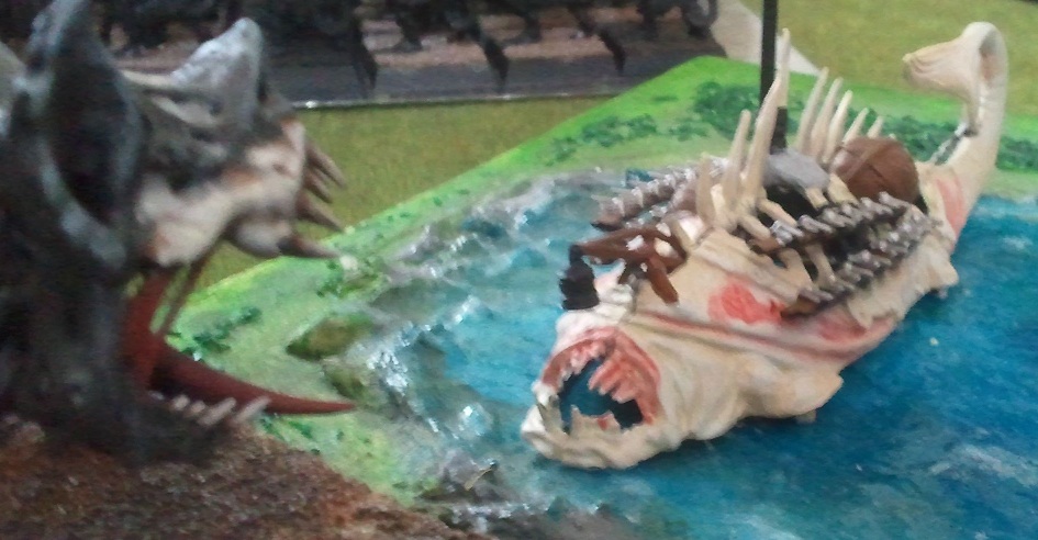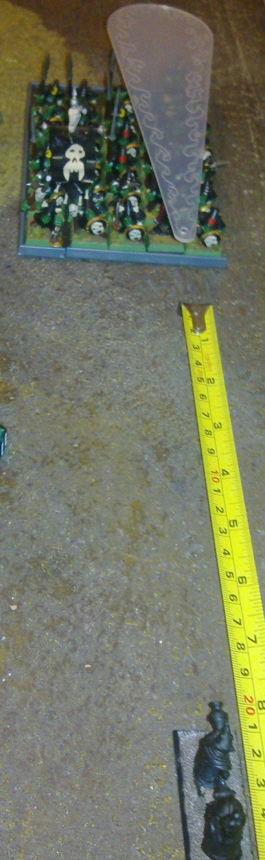 Warlocktechniker Trop, der nach dem Treffer durch die feindliche Kriegsmaschine das letzte Jezzails-Team mit dem Versprechen „Bleibt hier, ich hole-hole Hilfe!“ verlassen hatte, schloss sich nun wieder dem Trupp an und erklärte, mit stolz geschwellter Brust, dass das aufgeblähte Schuppen-Ding nur auf sein Zutun hin, die Gefallenen auferstehen ließ. Sogleich befahl er dem Trupp sich in Richtung der des riesigen geflügelten Tot-Ding neu auszurichten. Während dessen hatten sich einige der kleinen, nervösen Schuppen-Dinge in die Flanke einiger Bogenschützen bewegt und diese mit den vergifteten Geschossen ihrer Blasrohre in die Flucht geschlagen. Der Meutenbändiger, der zuvor die Todeswölfe mit seinen Riesenratten niedergemacht hatte, sah sich nun mit einer großen Einheit Tot-Dinger gegenüber, welche eine schwere Rüstung trugen und großen Zweihandschwerter in ihren untoten Händen hielten. Er wusste, dass das Drehen seiner Meute viel zu lange dauern würde, um zu entkommen und so trieb er seine Meute so schnell er konnte an den Tot-Dingern vorbei (Moralwurf auf 5), so dass sie sich erst in seine Richtung drehen mussten, eh sie auf ihn los stürmen konnten. Das bedeutete ein paar weitere Sekunden, um sich einen sichereren Platz zu suchen.