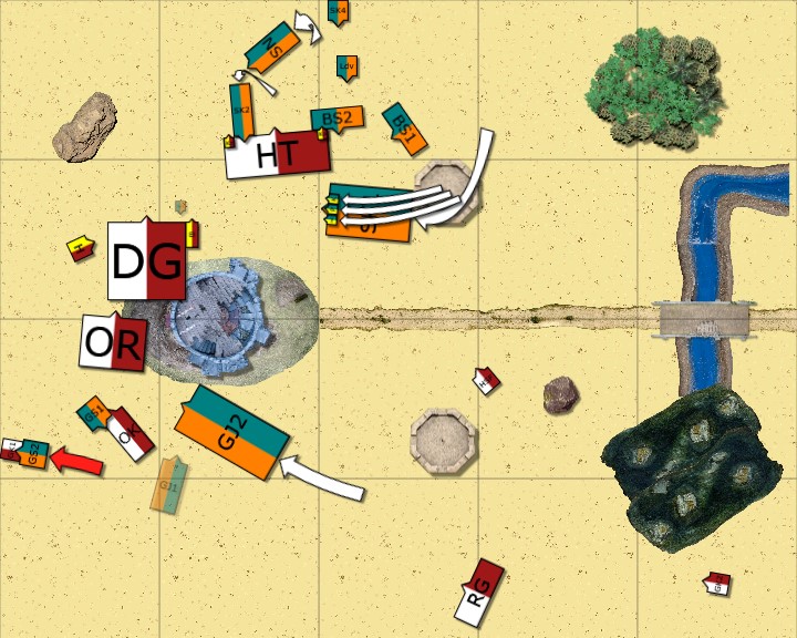 Bezüglich warten und später angreifen noch ein Anmerkung - wenn wir uns auf die OR zubewegen um der Reichsgarde für diese Runde zu entgehen und die OR zu beschiessen, wird es die Runde darauf keine Ziele mehr geben, denn die OR werden maximal nach vorn marschieren und den General aufnehmen, damit sind sie aus unserer Reichweite raus und durch den General nicht mehr sinnig angreifbar. Die Grabjäger können sich dann ggf umdrehen und auf die RG ausrichten, aber der Angriff von denen wird durch Stärke 6 halt auch nicht besser. Dazu kommt das HFSK und die 2. Kanonen dadurch halt voll reinhalten können.