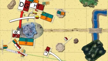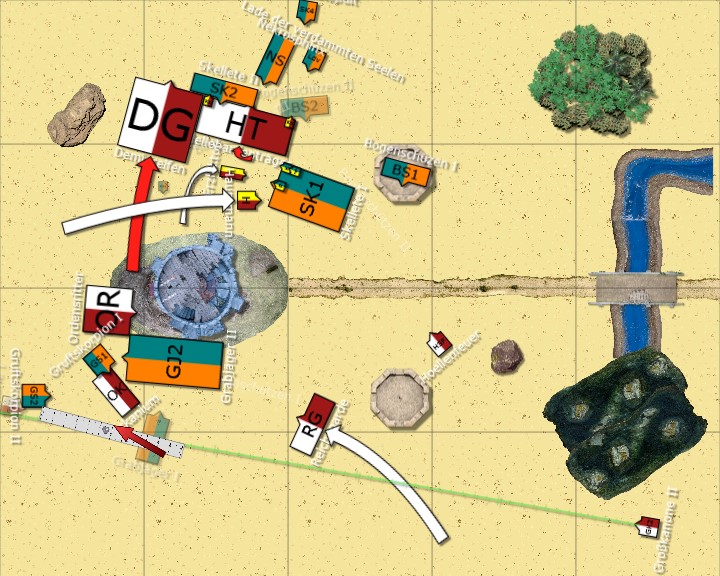 Dann würden wir gern zuerst mit der Großkanone auf den Gruftskorpion schießen und den roten Pfeil als ersten Aufschlagspunkt wählen... Das Line of Sight Tool konnte ich nicht genauer auf den Skorpion ausrichten, ich hoffe das passt trotzdem soweit.