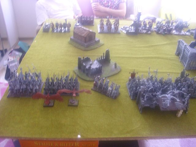 Die Aufstellung war wie auf den Bildern zu erkennen. Ich habe ein stabiles Zentrum mit meinem Löwen-Todesstern und der Phoenixgarde an deren Flanke gebaut, dahinter auf erhöhter Position alle 3 Speerschleudern.