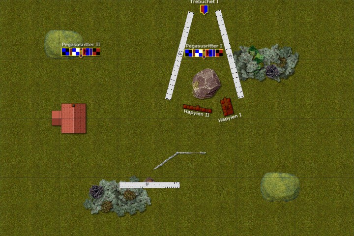 Eine kurze Info: die Harpien müssen das Ziel das sie angreifen doch sehen. Somit können sie von hinter dem Felsen unsere Trebuchets nicht angreifen sondern müssen noch eine Bewegung machen.