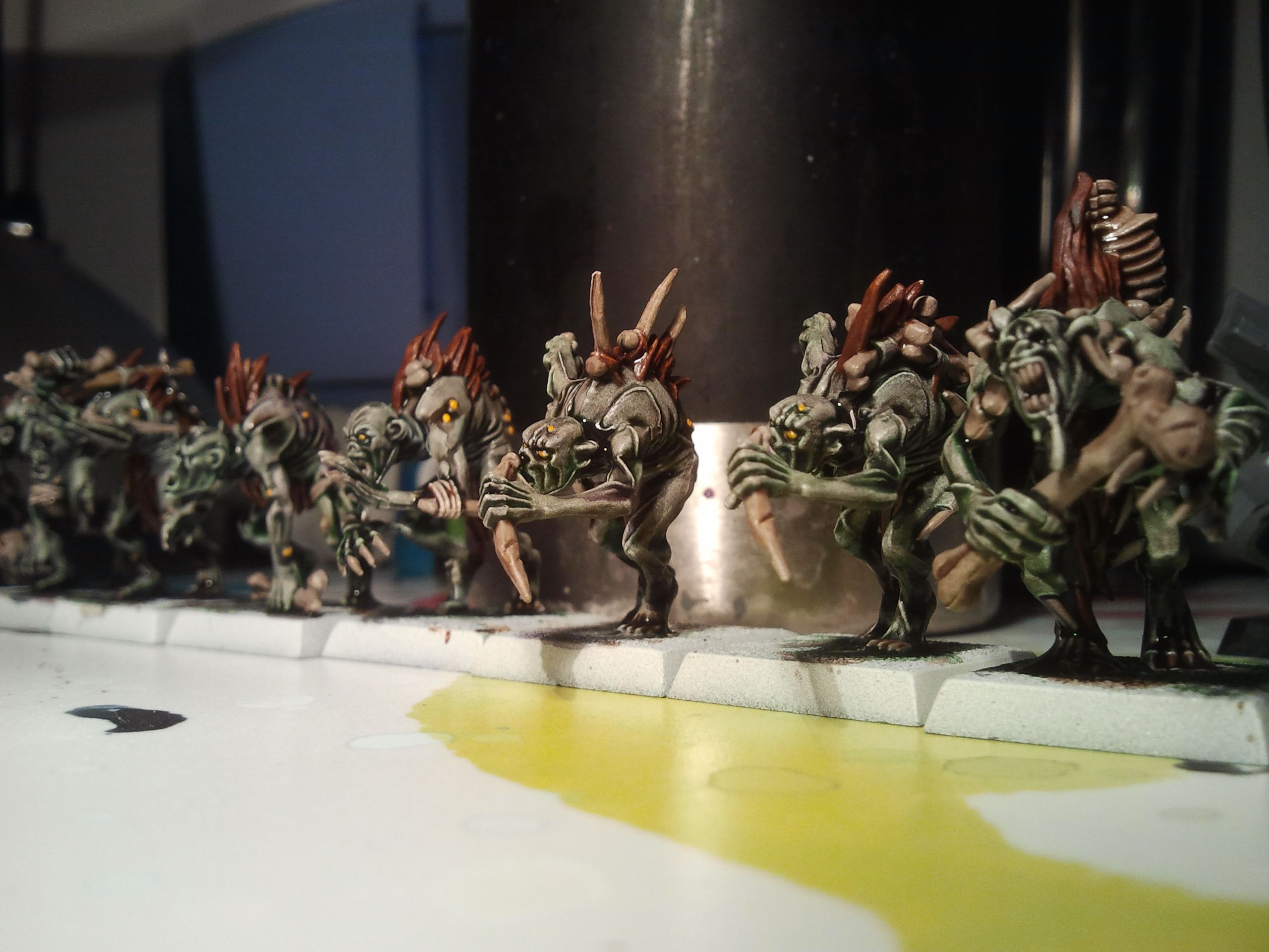 Meine ersten zehn Grufghule habe ich weiß grundiert. Danach habe ich sie mit einer Schicht Thrakka Green getuscht, als diese getrocknet war eine Schicht Leviathan Purple. Sieht so weit wirklich gut und interessant aus, finde ich. Lustig ist, dass man den Lilaton sogut wie gar nicht erkennen kann, sondern das Fleisch nur "verrotteter" aussieht.
