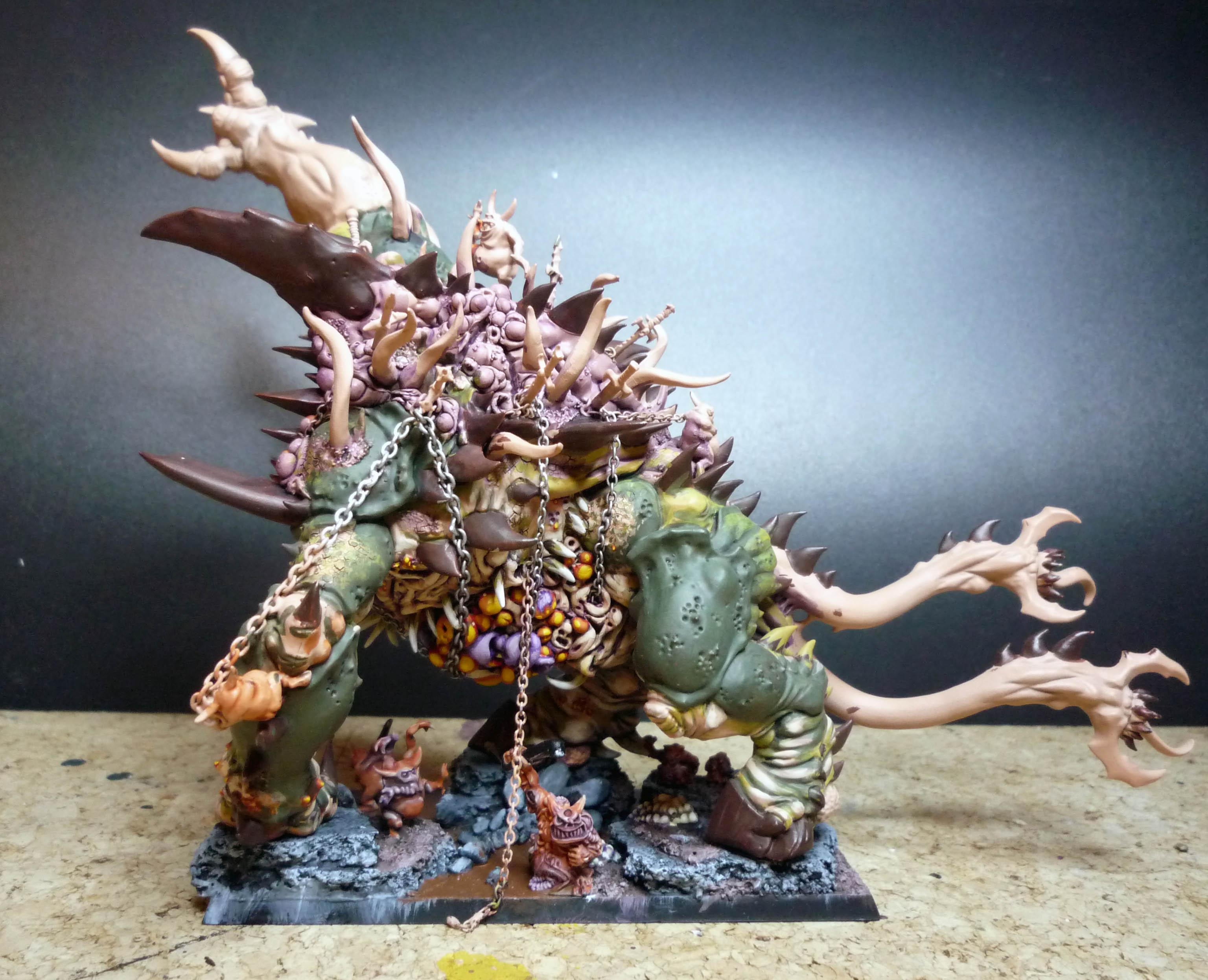 Es befinden sich nun mehrere Nurglings auf dem Rücken die an den Ketten, die den Bauch stützen, ziehen.