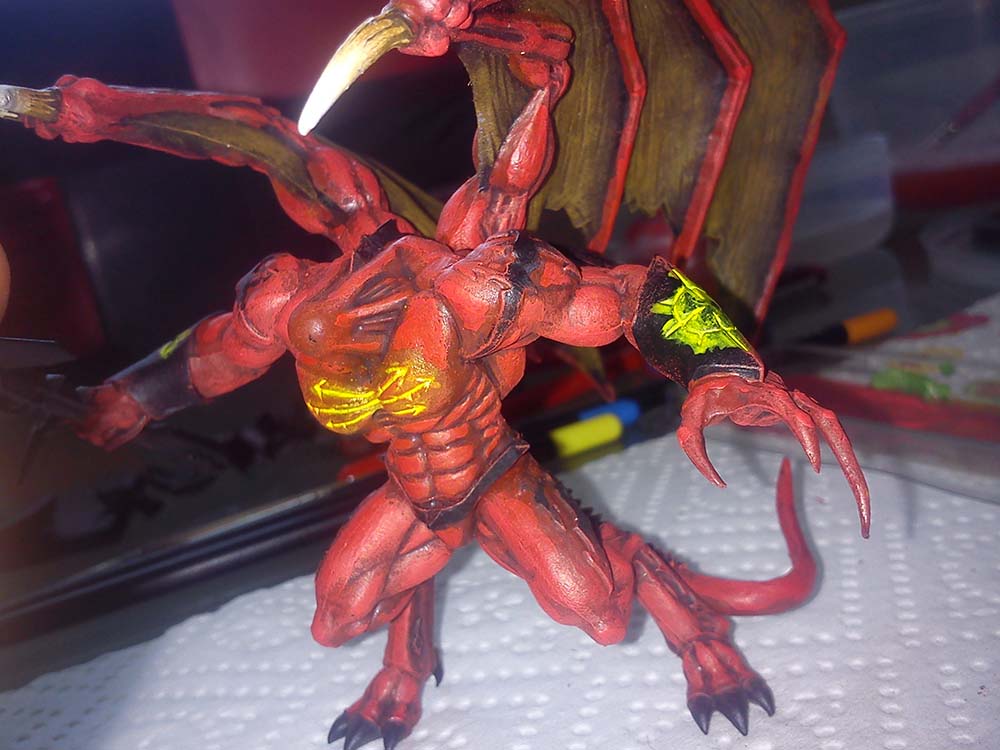Der Dämonenflügel sieht bisher so aus als ob er Schwarz grundiert worden und dann der Arm mit einem alten GW Rot (Blood Red) bemalt worden wäre.