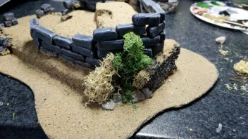 ist ja noch nich fertig, der sand wird noch ein wenig verdunkelt, und das grün auch. Mein streu is selbstgemacht, eingefärbte sägespähne....aber da meine seraphon und dazugehörige platte wüsten thematik sind wollte ich mit der ruine einen alten aussenposten in der wüste darstellen