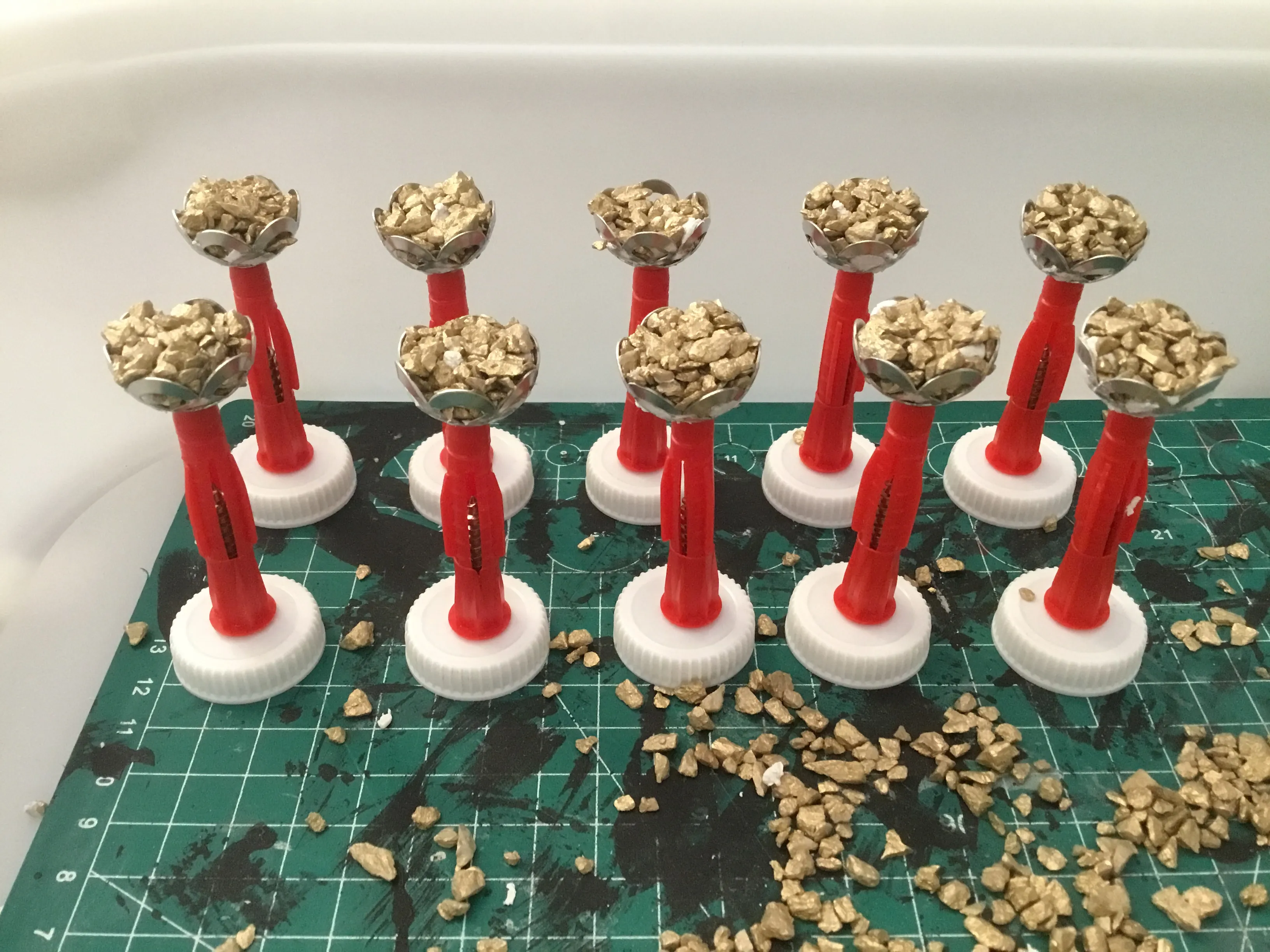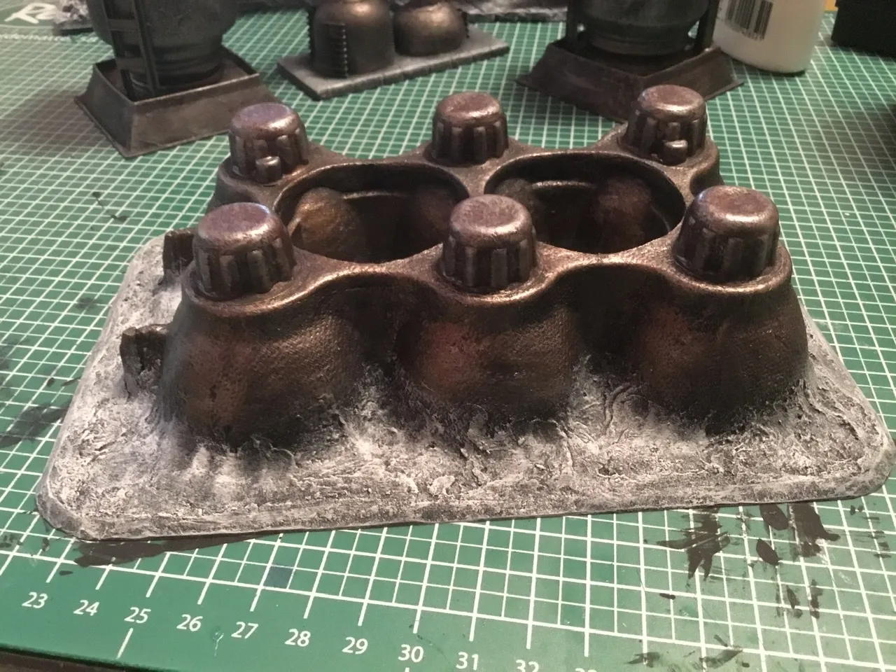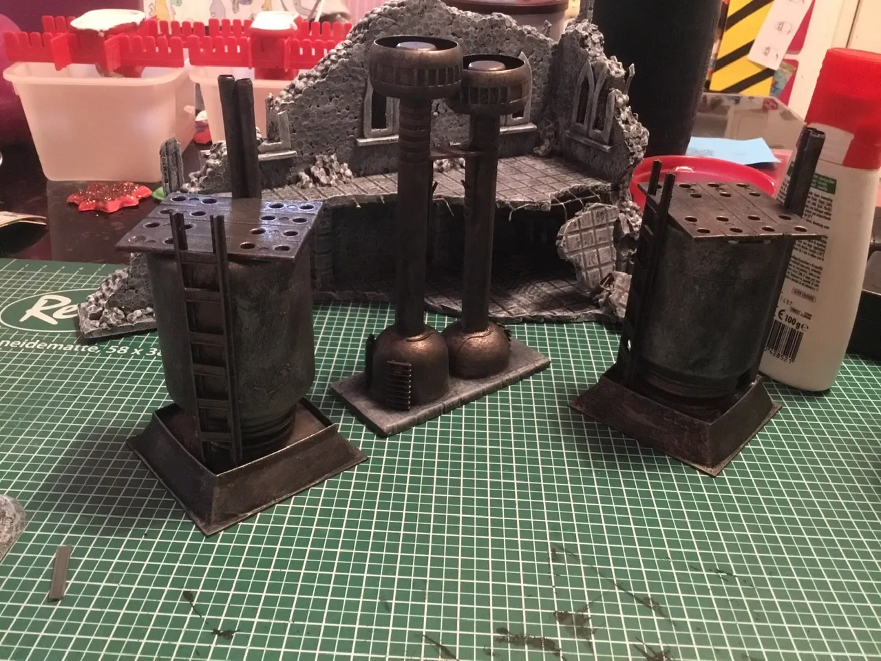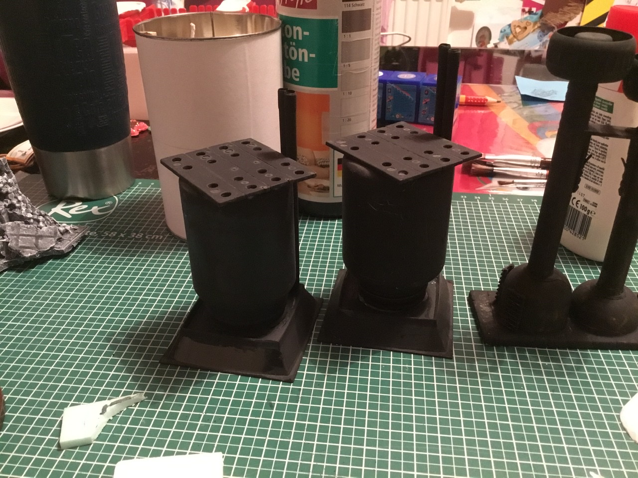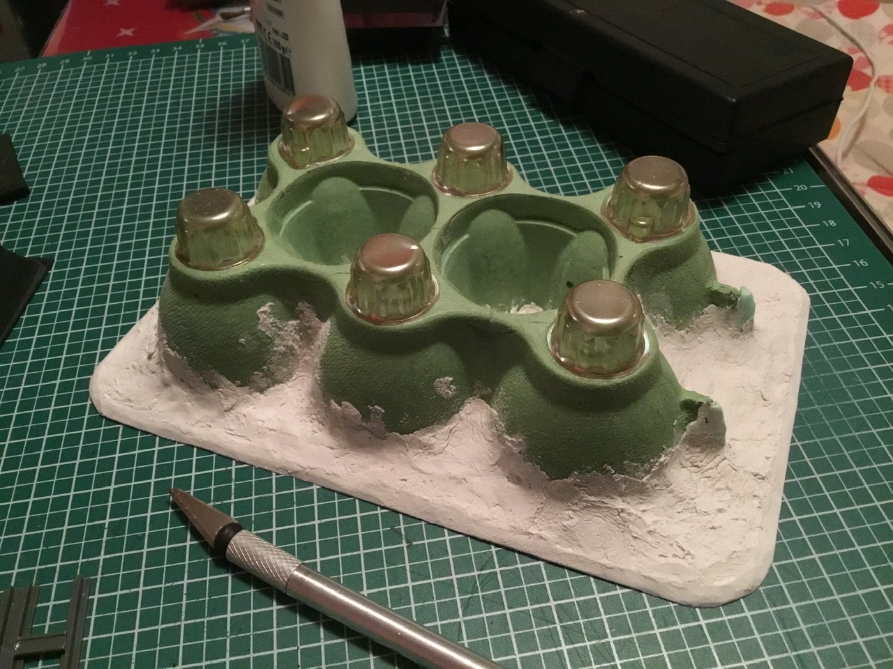 Und zum Schluss noch eine Gruppe versenkter Tanks, bestehend aus Styrofoam (Base), Eierkarton (Tanks) sowie Verpackungsmaterial (Ventilkappen), aufgehübscht mit Spachtelmasse.Grüße,