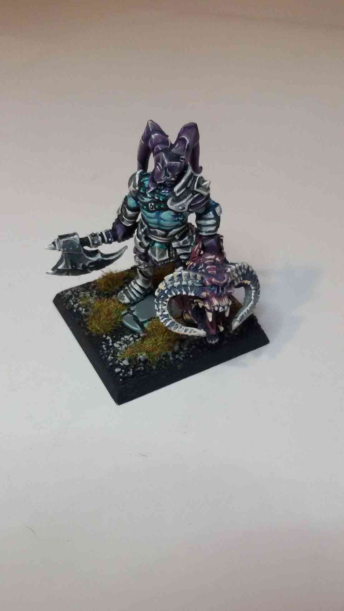 Die Rache am Dämon war vollendet. Ein duzend Überlebender Dorfbewohner warfen ihm blicke voller Entsetzen zu. Ihm war es jetzt klar, den kleinen jungen Lokirian gab es nicht mehr, nur noch Loki den Dämonenfresser. Es gab kein Zurück. Selbstzufrieden und verbittert zugleich nahm Loki den Kopf des Dämons als ewige Erinnerung und als Warnung zugleich, für alle Dämonen des Warps. Zwei Hiebe zerschmetterten den Herdestein. Sein neuer Meister rief ihn, doch bevor er gehen musste blieb noch etwas Zeit..... Ein paar "Rinder" mussten noch geschlachtet werden.