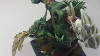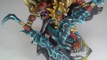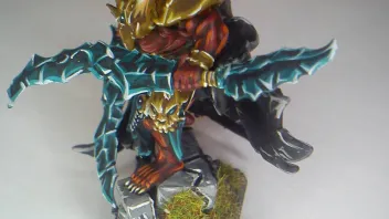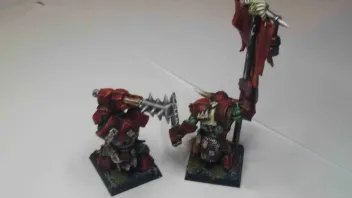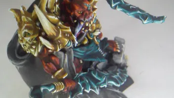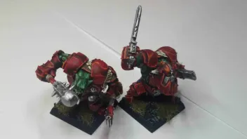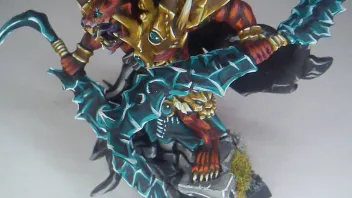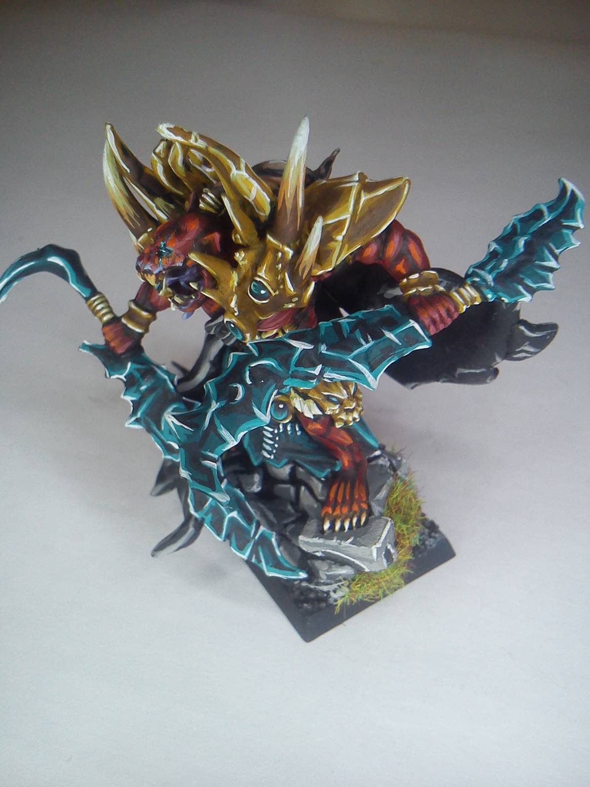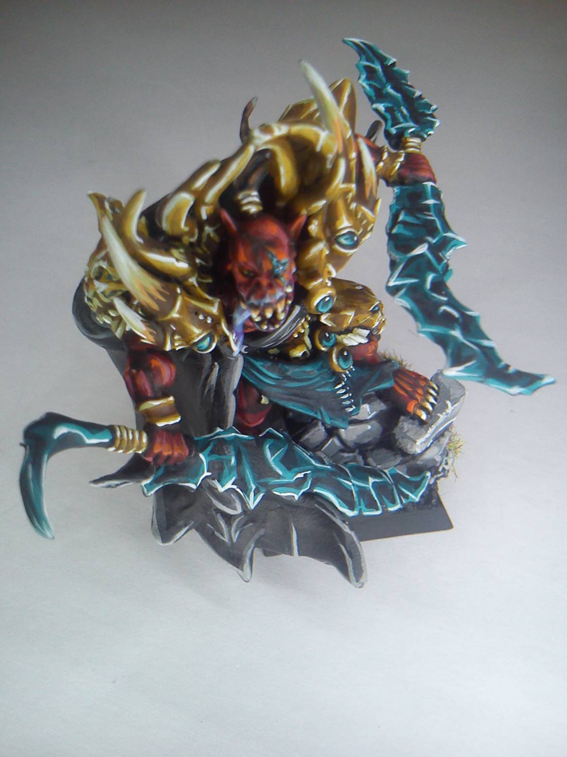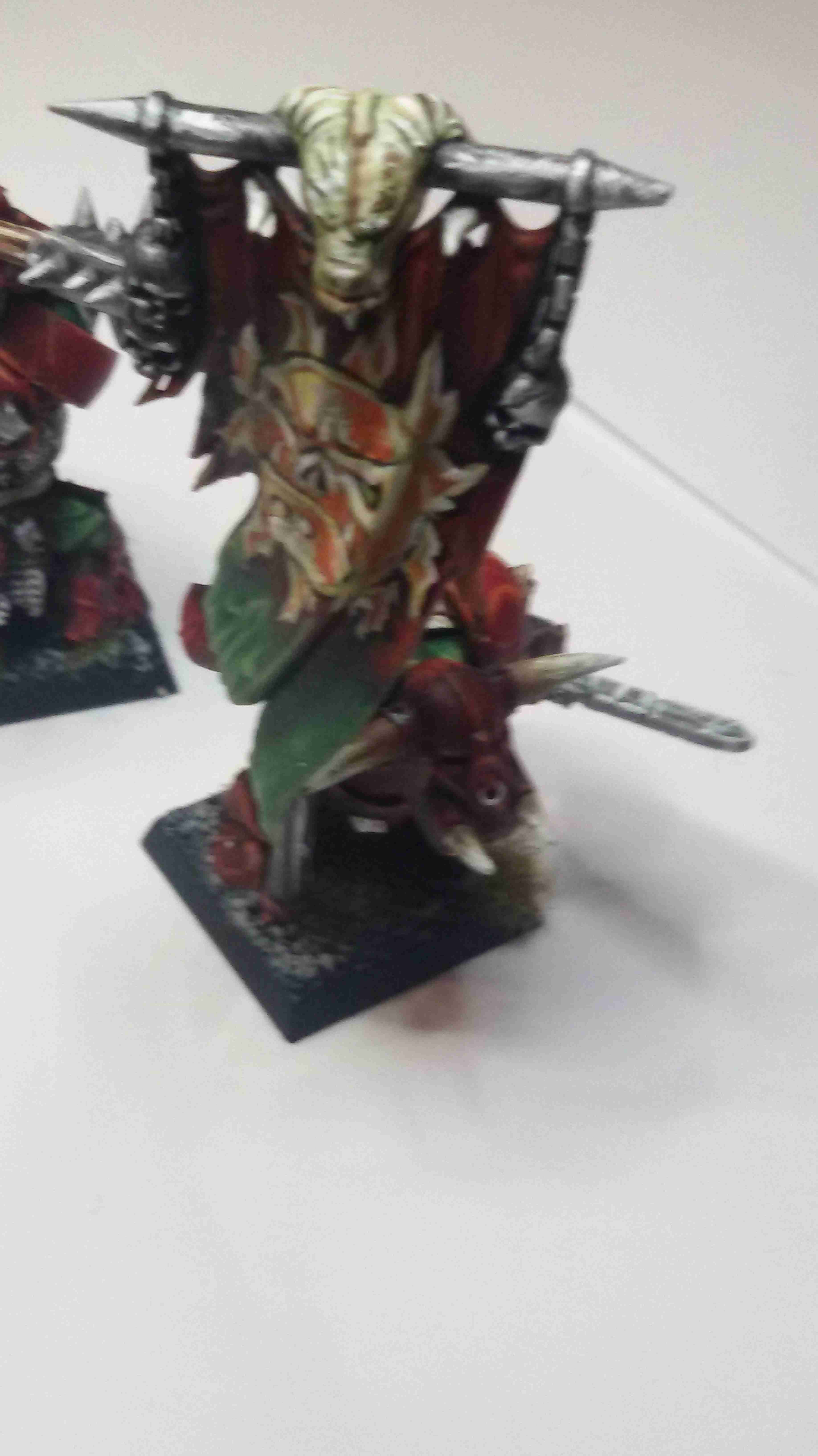 Nun war er auf dem Weg zu Khorne, er würde den Stier bei den Hörnern packen müssen wenn er hier weg wollte. Der Schädelpfad wurde gut bewacht, riesige Hunde, Zerfleischer die auf monströsen Dämonenreittieren sowie größere Dämonen behinderten sein vorankommen. Zwei Blutdämonen stellten sich ihm entgegen. Der größere sprach in donnernder Stimme:„ Du kommst hier nicht vorbei kleiner, dein Schädel wird bald die Knochenebene schmück….“
