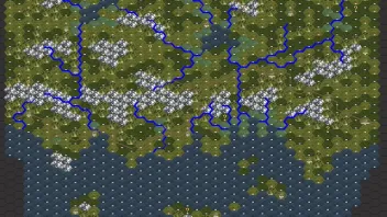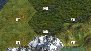Zu sehen: Wasser, Ebenen, Hügel, Wälder, Berge, Sümpfe und ganz wichtig: Feldnummern (Die werden das ganze deulich vereinfachen... "Ich baue auf Feld 3711 eine Mine." ist einfacher als "Ich baue auf dem Berg 3 Felder links von meiner Stadt links der Hauptstadt eine Mine.""Da?""Nein, das Feld darunter"... ).