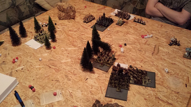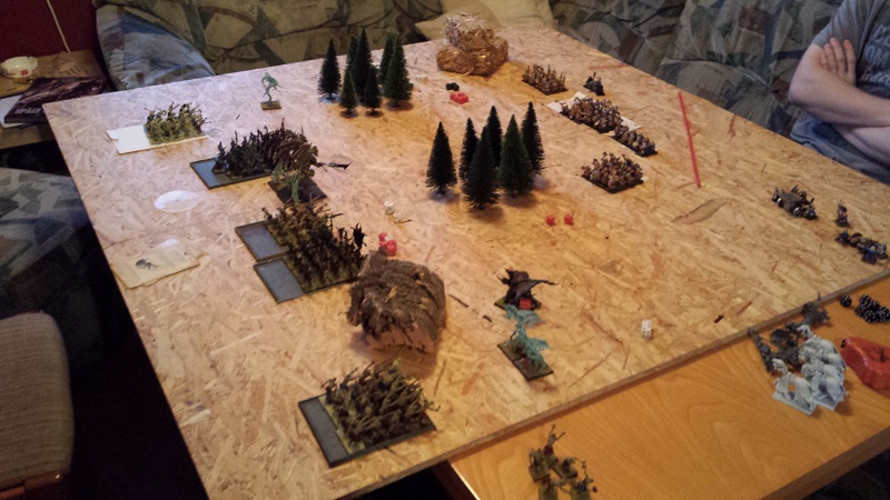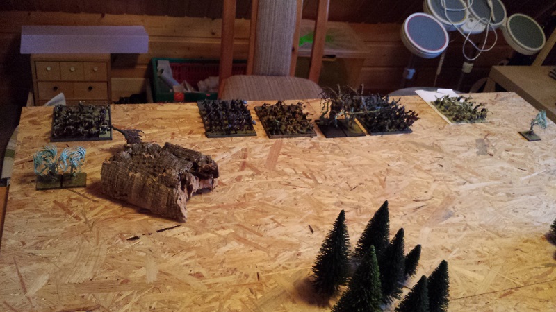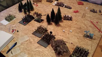 Nachdem das Gelände aufgebaut wurde, stellten wir auf. Der Zwerg fing an und war am Ende auch schneller fertig als ich (welch ein Wunder). Dadurch erhielt er +1 auf den Ini Wurf. Denn versaute er jedoch mit einer 2. Ich hingegen warf eine 4. Also gings für mich nach vorne! Achja, als Zauber hatte Manni: Anrufung des Nehek, Tote erwecken, Fluch der Jahre und Nagash Todesblick.