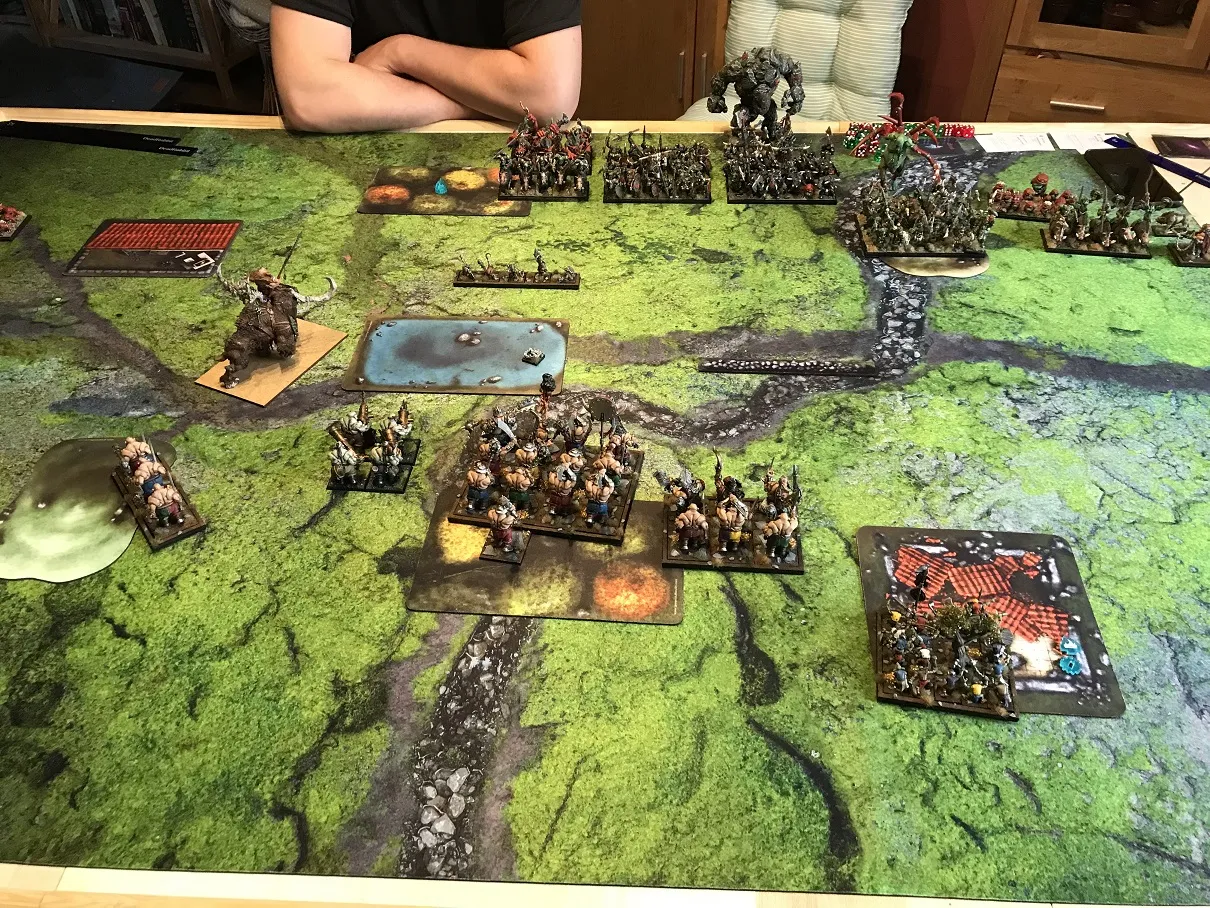 Das Ligaspiel wurde leider verschoben. Aber wird noch nachgeholt. Stattdessen konnte ich spontan meine Oger gegen eine Orkhorde ins Gefecht werfen.