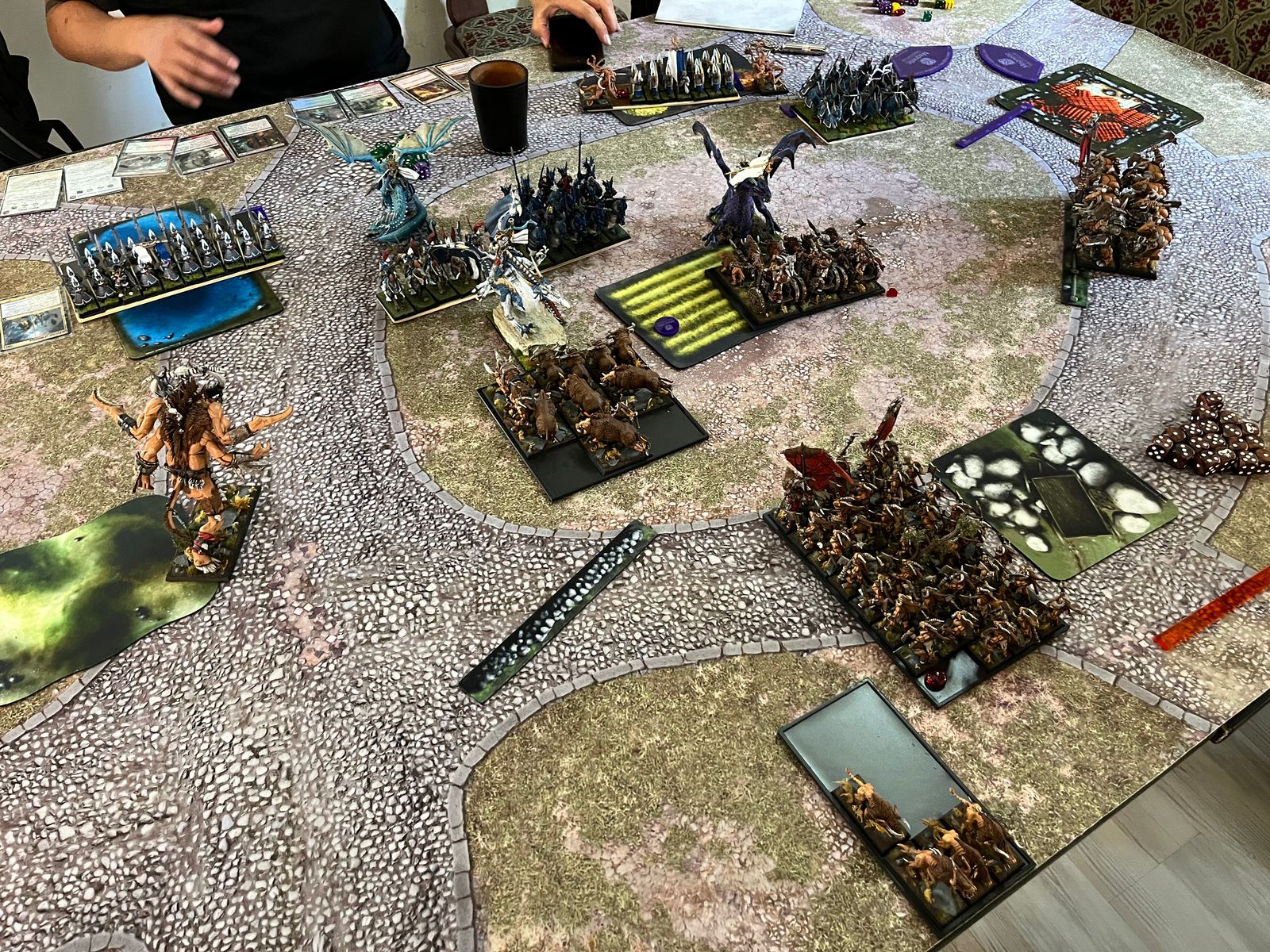 Ich glaube nicht, dass mir das jemals wieder passieren wird. Ein bis zwei Runden später beendeten wir dann die Schlacht, als nur noch sehr wenig der Hochelfen am Leben waren.Die Hochelfenarmee spielte danach nochmals gegen Chaoszwerge und da holten die Drachen dann alles raus und spiel gewannen sie richtig deutlich. Das fand ich dann bei so einem Spieletag auch wieder gut, dass da jeder sein Erfolgserlebnis hat.