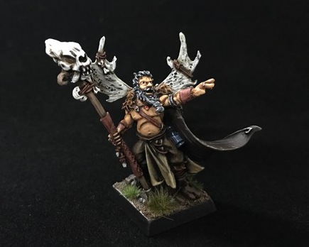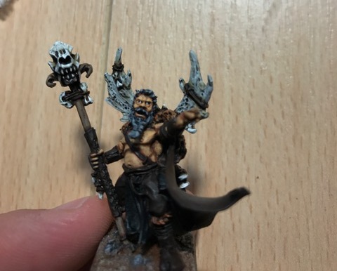 Habe mich bei der Bekleidung für Brauntöne entschieden. Seinen Anhänger am Hals habe ich als Akzent rot gemacht und die Flasche ist blau, dadurch hat er genau die Farbe dabei, die der Rest der Armee auch hat.