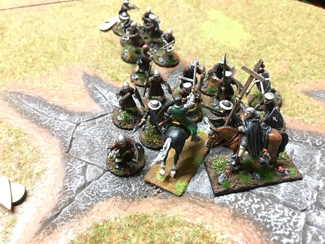 Meine Ordensritter traten mit ihren vier neuen Armbrustschützen gegen Krieger aus Westeros an. Mein Gegner hatte sich Krieger passend zu Game of Thrones gebastelt und spielte diese nach den Kreuzfahrer-Regeln. Die schicken Gebäude sind auch von ihm.
