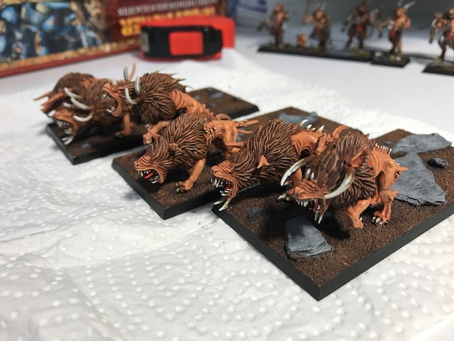 Mein Bruder meinte zwar, dass ich es mit den Einheitenfüllern für die Chaoshunde übertrieben habe...., aber ich denke, wenn da mal ein Streitwagen hinten dran hängt und ein paar Gor Platz genommen haben, wird man die Streitwagen erkennen. ;)