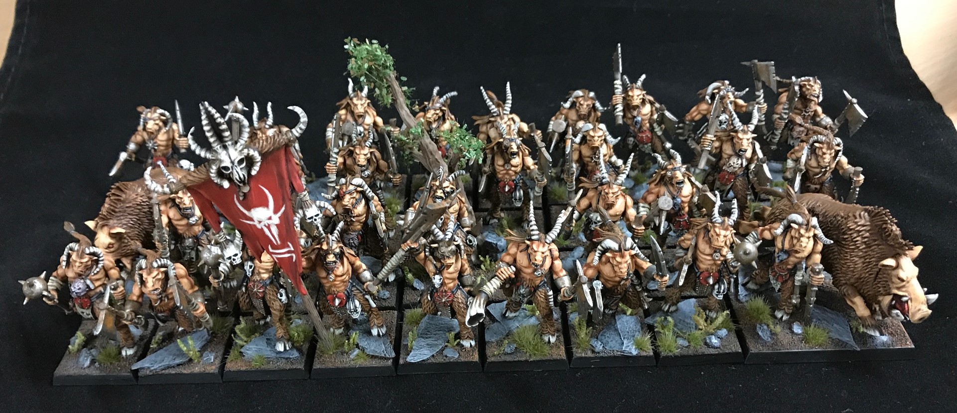 Ich war übrigens mit den Tiermenschen am Start. Es wurde zwar noch etwas improvisiert, aber man konnte das Meiste erkennen und ich wollte nicht mit kompletten (bzw. zu vielen) Proxis spielen. Also waren es nur 3600 Punkte Schlachten, wobei man da auch einiges aufstellen kann, wie man auf den Bilder sehen kann.