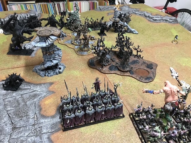Die Barbaren mit Riesen finde ich sehr langsam. Dazu mit Riesen sehr teuer. Außerdem ist die Einheit nicht so stark. Wir haben sie später mal gegen einen Ghorgor antreten lassen. Der Riese selber hat nur 5 Attacken, auch wenn er gegen große Ziele Multiple Wunden macht, so muss er mit KG3 erstmal treffen und dann mit Stärke 6 auch verwunden... Ein großer Vorteil beim Riesen ist ja, dass er stärker wird, wenn er Lebenspunkte schon verloren hat... Da er aber im Trupp nicht angekratzt wird und der Gegner für das Kampfergebnis auch eher auf den Trupp also auf den Riesen einschlägt, werden seine Attacken nicht mehr werden.... weiß also nicht, ob ich den nochmals einsetzte...