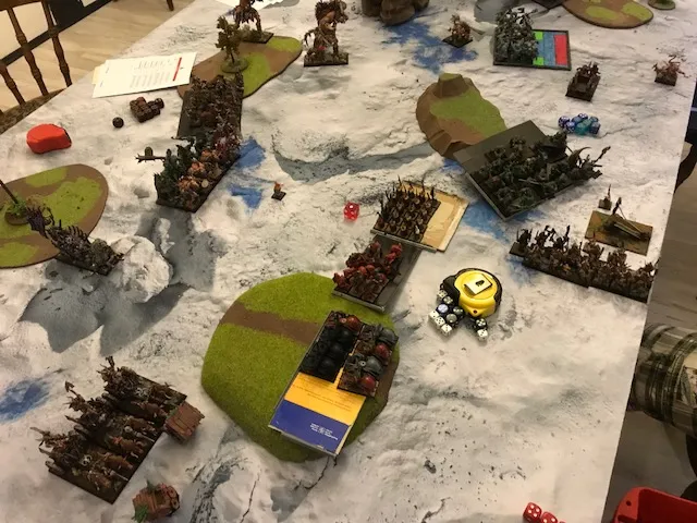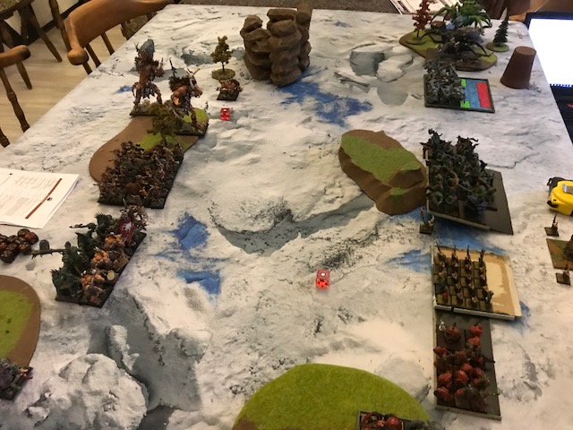 Wir spielten auf einer richtig coolen Spielmatte, die neu im Spieleclub Kassel ist. Ok, das Gelände ist jetzt nicht unbedingt auf die Schneeplatte abgestimmt... aber es ist ja quasi Fantasy und da ist alles möglich. :tongue:
