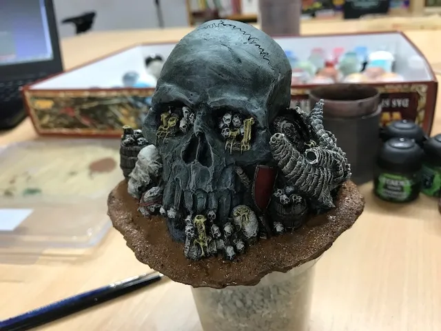 In Sachen Gelände habe ich nun den Hügel noch mit Mattlack versehen, damit alles etwas länger hält. Und ich bin nun dran am Schädel, den ich neulich mal von MOM Miniatures gekauft habe.