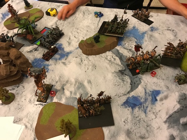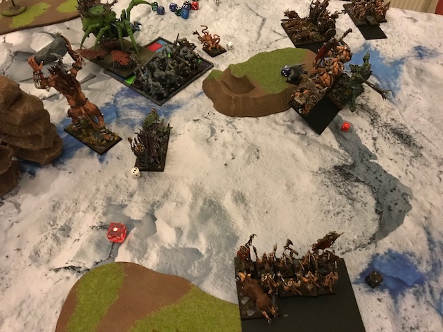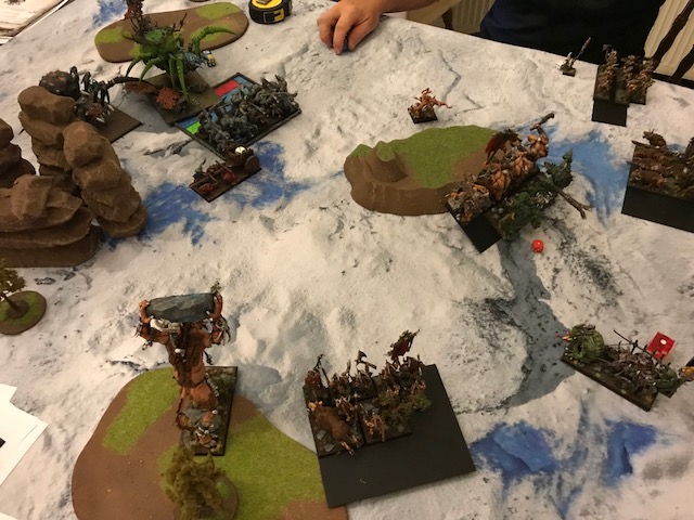 Links wagte ich einen Angriff mit meinem Ghorgor auf die Armbrustschützen, doch was passierte da? Auch diese Einheit verpatze ihren MW Text auf die 9 und lief weg. Spätestens jetzt, wäre ein AST in der Armee sehr sinnvoll gewesen. Ich lenkte um, aber schaffte es nicht in die Schwarzorks und damit die nicht angreifen konnte, ließ ich den Gnargor den Block ausbremsen.