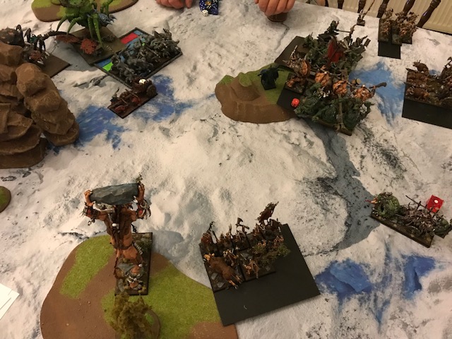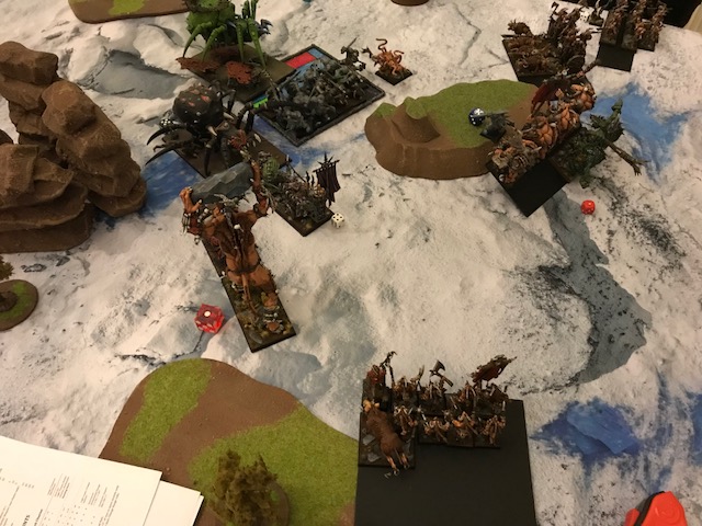Links links lief es sehr gut aus Sicht der Orks, denn der Ghorgor konnte gegen zwei Spinnen nichts ausrichten und auch der Gnargor konnte besiegt werden, doch der Streitwagen lief so unglücklich vor den Schwarzorkblock, dass diese nicht vorwärts kamen.
