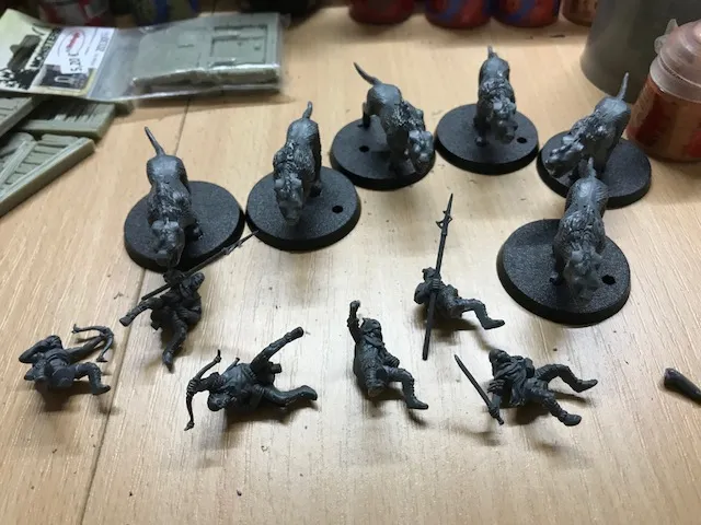 Ich bin mir nicht sicher, aber bei der ganz alten Zinnbox waren, glaube ich, nur fünf Reiter drin; in dieser Box sind es sechs Reiter. Leider haben die Warg nur zwei unterschiedliche Posen, aber dafür sehen die Orks darauf alle anders aus. Zwei mit Bögen, zwei mit Speer und zwei mit Schwert. Schilder sind 6 in dem Gussrahmen drin. Außerdem noch drei Bögen mit Köchern und vier Schwerter, die man alle als zusätzliche Ausrüstung irgendwo platzieren kann.