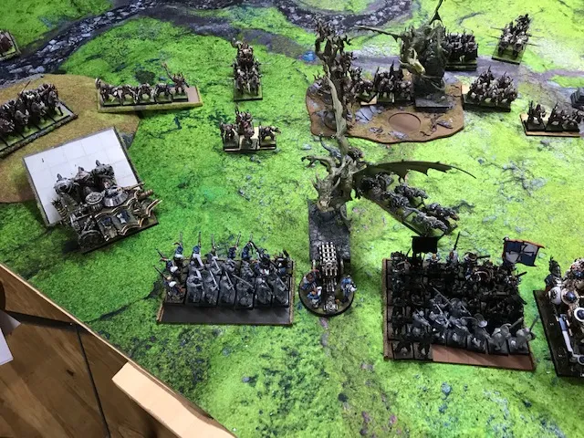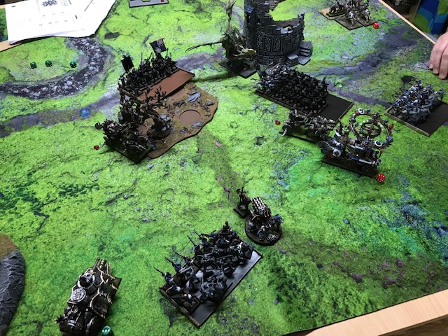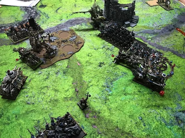 Ich hatte nun zwar etwas aufgeräumt, aber die Bihandkämpfer standen mitten im Spielfeld und der Großteil der Chaosarmee davor! Es begann also die Crunchtime!