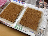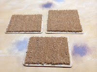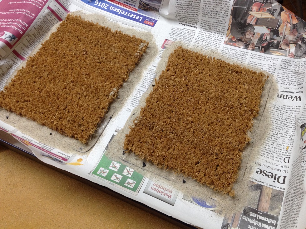 Die Felder wurden einfach aus der Fußmatte herausgeschnitten und dann auf ein Baste aus dem Tischuntersetzer geklebt. Dazu kann etwas Sand, das passend zum Spieltisch bemalt wurde. Um das Ganze etwas aufzulockern, kamen noch ein paar größere Steine hinzu.