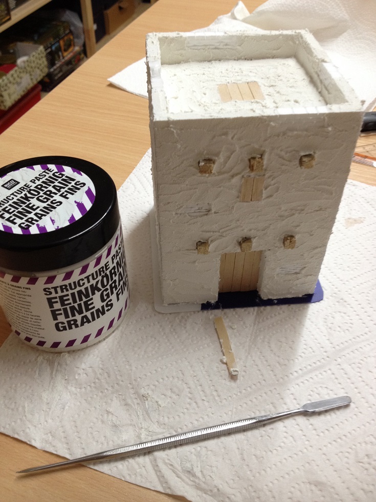 Dann wurden die Mauern verputzt. Dazu habe ich feinkörnige Strukturpaste verwendet.