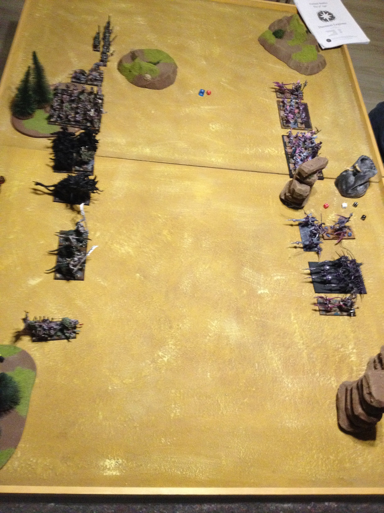 Wie man sieht haben wir diagonal aufgestellt. Ich durfte zuerst aufstellen und brachte sofort meine gesamte Armee auf das Spielfeld, damit ich eine Schussphase weniger abbekommen konnte. Das war auch gut so, denn er hatte zwei Katapulte und ein großes Katapult dabei (wenn man dadurch Verluste erleidet, war man plötzlich im schwierigem Gelände...).