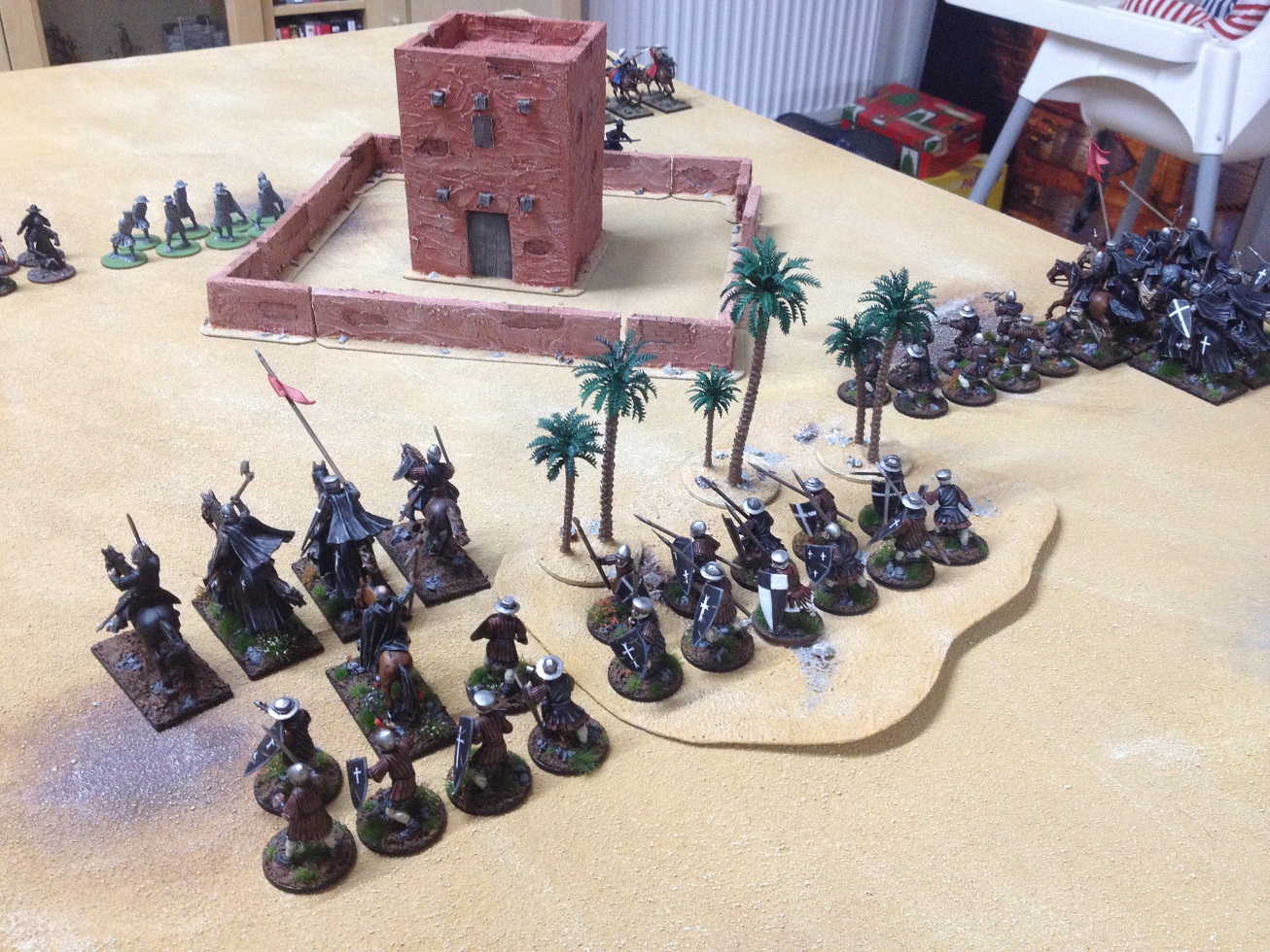 Wie man sieht haben wir diagonal aufgestellt. Ich durfte zuerst aufstellen und brachte sofort meine gesamte Armee auf das Spielfeld, damit ich eine Schussphase weniger abbekommen konnte. Das war auch gut so, denn er hatte zwei Katapulte und ein großes Katapult dabei (wenn man dadurch Verluste erleidet, war man plötzlich im schwierigem Gelände...).