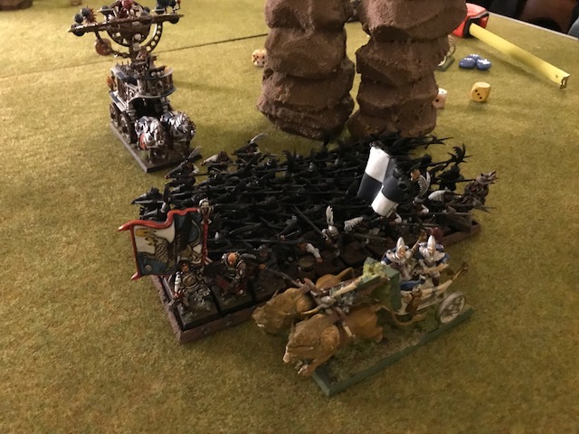 Von den Chaoszwergen war mittlerweile nicht mehr viel übrig. Die ganze Goblinarmee positionierte sich und die Kurbelwagen krachten in die paar Hobgoblins rein.