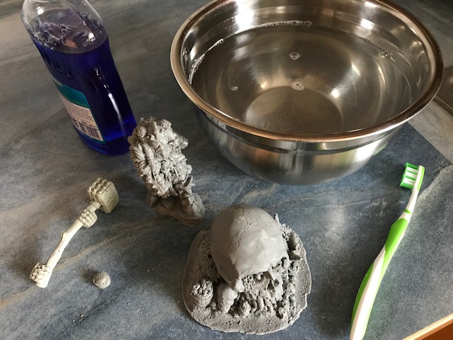 Die Resinteile haben nun ihr Seifenbad genossen... danach wollte ich noch die Keule biegen, dass sie an die Arme dran passt... erst hat das mit heißem Wasser ganz gut geklappt und es hat sich biegen lassen... doch dann habe ich es wohl übertrieben...