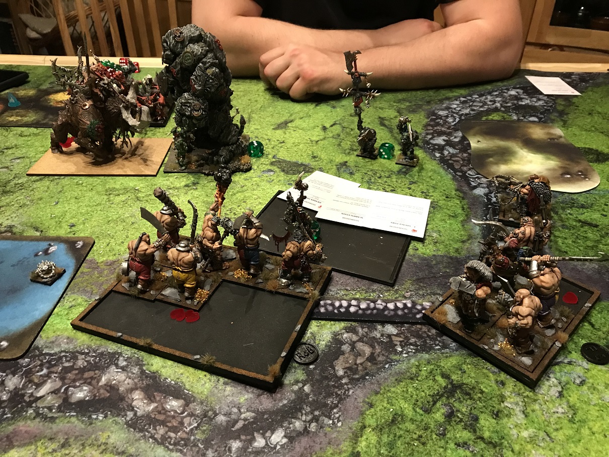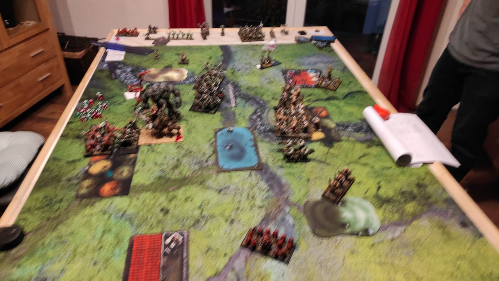 Das Ligaspiel wurde leider verschoben. Aber wird noch nachgeholt. Stattdessen konnte ich spontan meine Oger gegen eine Orkhorde ins Gefecht werfen.