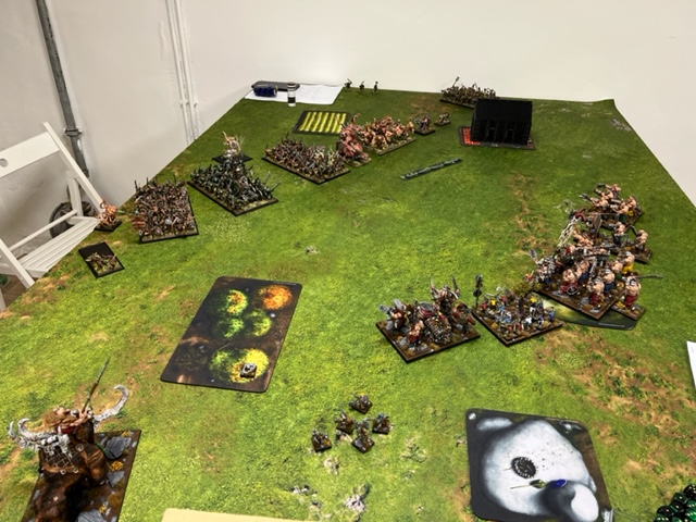 Die Skaven hatten vier große Blöcke dabei und einen riesen Trupp mit Rattenogern. Dazu den übliche Rattendämon, der alles Fearless machte und eine Brut. Eine Glocke war auch mit dabei, dazu drei Assasine, Doomblade Lord und ein Seuchenpriester.