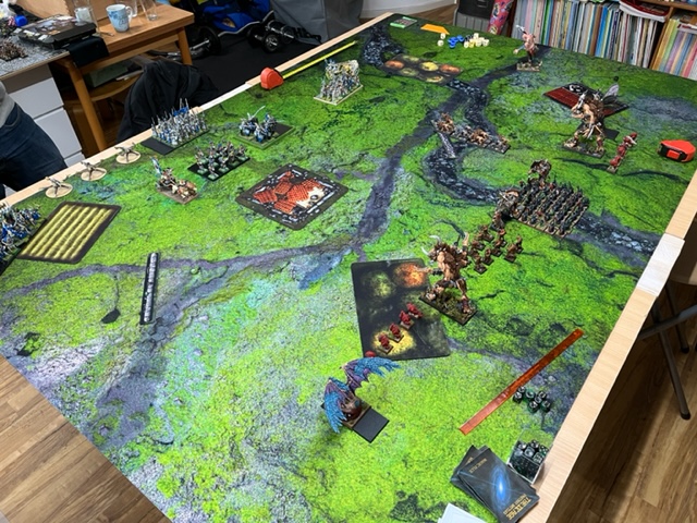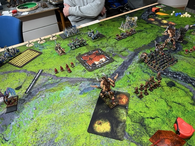 Als dann auch noch die Legionaries gegen die Gnoblar nicht den Nahkampf gewinnen können, ich mit den Ogern in die Flanke der anderen Skaveneinheit kommen kann und der Auroch in den Rücken des Rattendämon angreifen kann, beenden wir das Spiel.