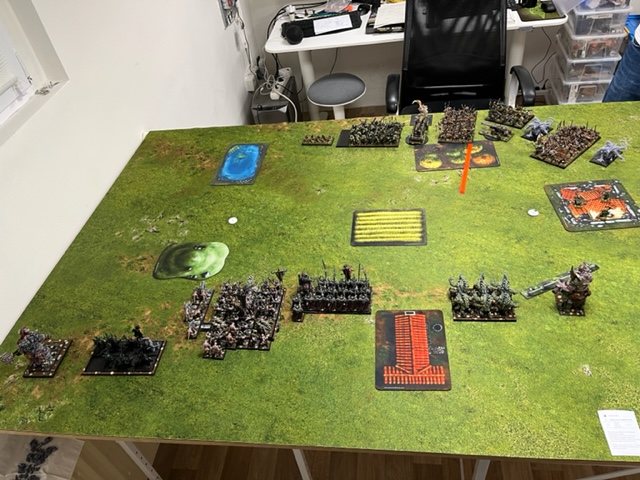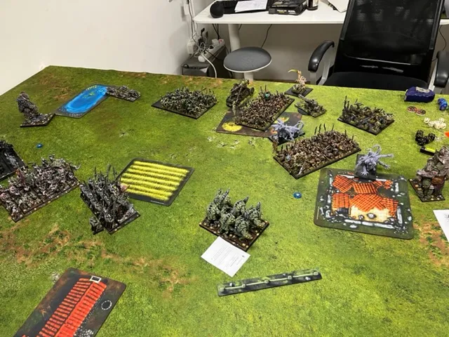 Im Hintergrund sieht man einen Fehler, der mir erst jetzt beim Schreiben auffällt. Die Hinterhalttruppen kommen beide. Es war schon sehr spät, als wir gespielt haben und es ist uns beiden nicht aufgefallen, aber da ich keinen Beastlord drin habe, kann ich ja erst ab der zweite Runde kommen. Mist, das ärgern mich gerade, aber war keine Absicht.