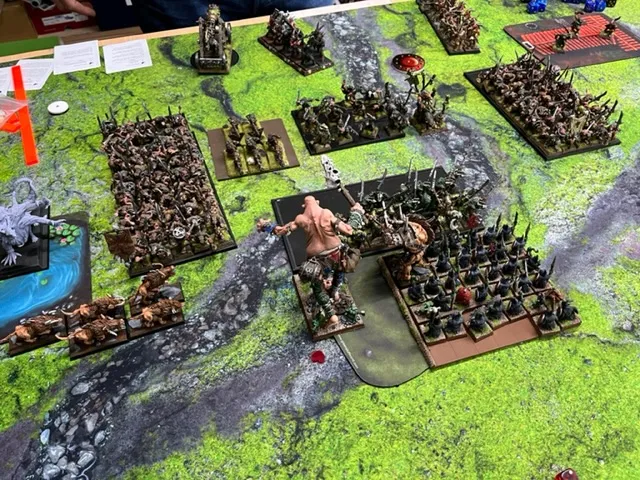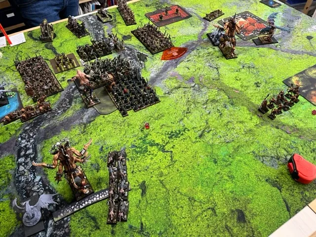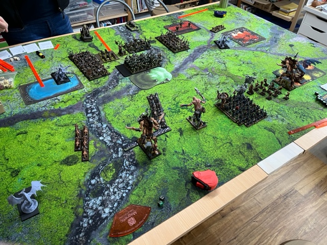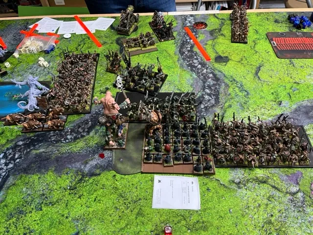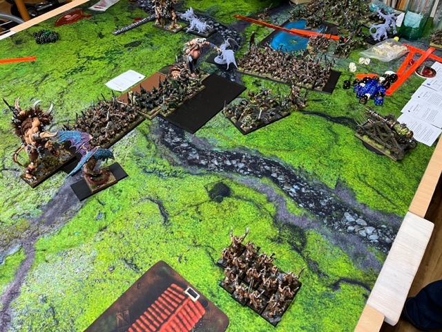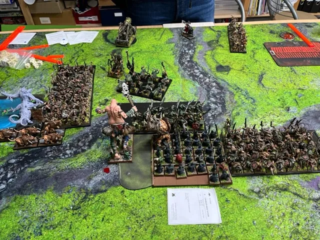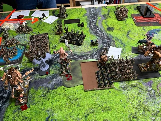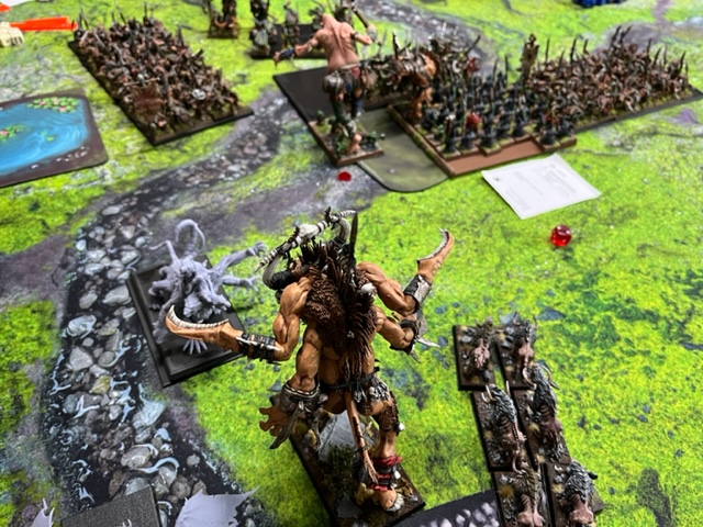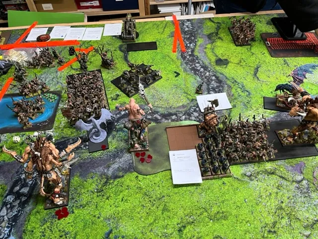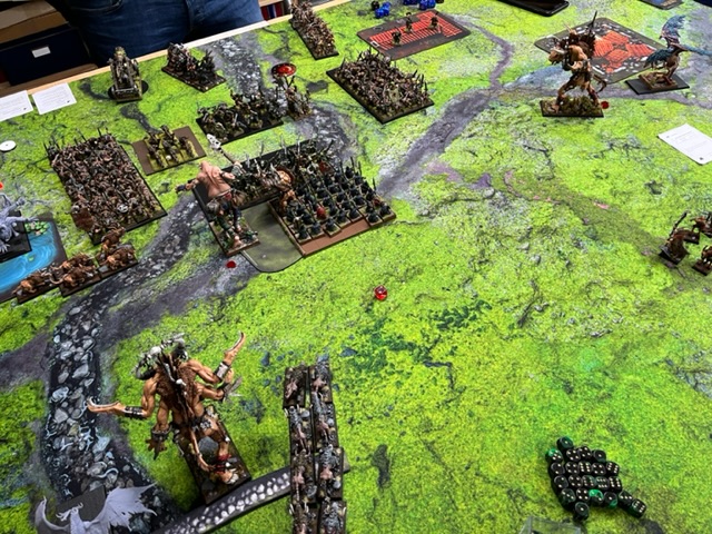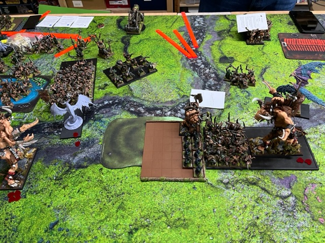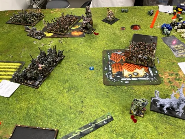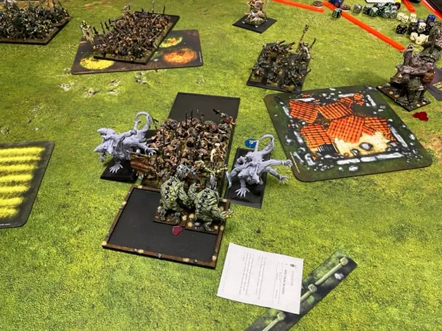 In der nächsten Runde kann der ausgerichtete Ungortrupp mit Minoheld in die Plänkler gehen und der Gortach in den Rattenblock. Außerdem sind noch Angriffe vom zweiten Jabberwocky und den Gors möglich. Damit verlieren die Ratten das Spiel.
