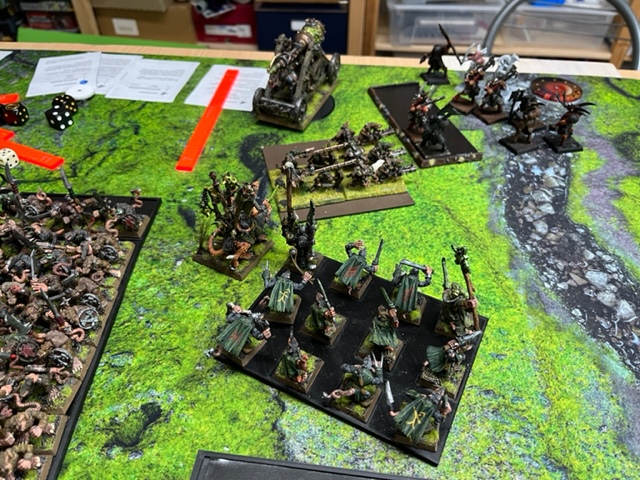Ich wählte den Hügel und die Skaven den Wald. Gleich zu Beginn stellte ich alles hin, weil ich keine Lust auf die zwei Kanonen hatte ich etwas näher ran an den Gegner wollte. Die Skaven nutzen das, um sich um ihren Dictator rum am eigenen Missionsziel zu platzieren und meiner linken Flanke einen möglichst langen Weg zu geben.