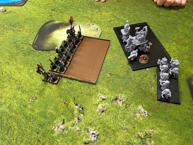 Die Zwerge stellen einen Eid-Stein hin und haben nun keine Flanken mehr... Und dann werfe ich auch noch die Netze auf mich selbst... den Nahkampf verliere ich um eins, aber halte dank AST und General.