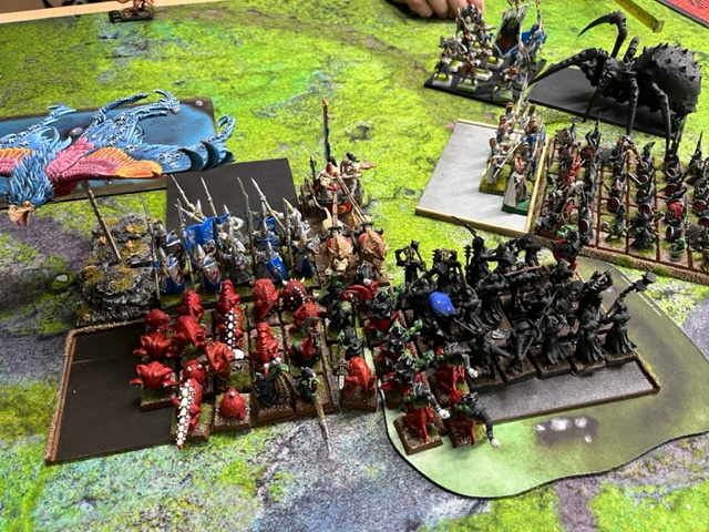 Hier schon ein Bild vom letzten Spielzug. Wie man sieht, haben wir uns ordentlich auf die Mütze gegeben. Links sieht man die neue Hinterhalt Goblins, die mit ihren Giftattacken die Hochelfenspeerträger fast erwerfen konnten. Die Bogenschützen rechts, in dem auch noch der Magier war, haben die Speerträger dann erschossen.