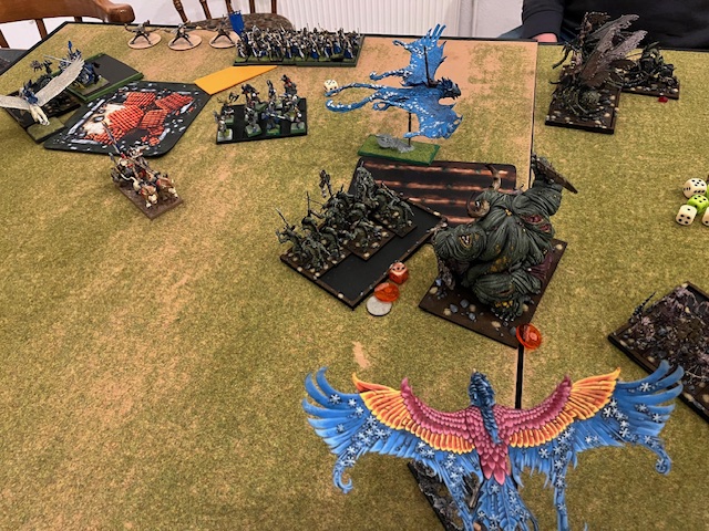 Das Spiel war vor allem auf der rechten Flanke sehr spannend, weil ich den Falkenreitern aus dem Weg gehen musste und gleichzeitig mit dem Gortach Druck ausüben wollte. Der Gortach war dann im ganzen Spiel auch der Unterschied. Ich konnte eine Einheit Dryaden töten und eine Einheit Bogenschützen verjagen. Der fliegende Held konnte meinen Gortach zwar dann ins Zentrum verjagen, aber was dann passierte war einfach nur Glück.